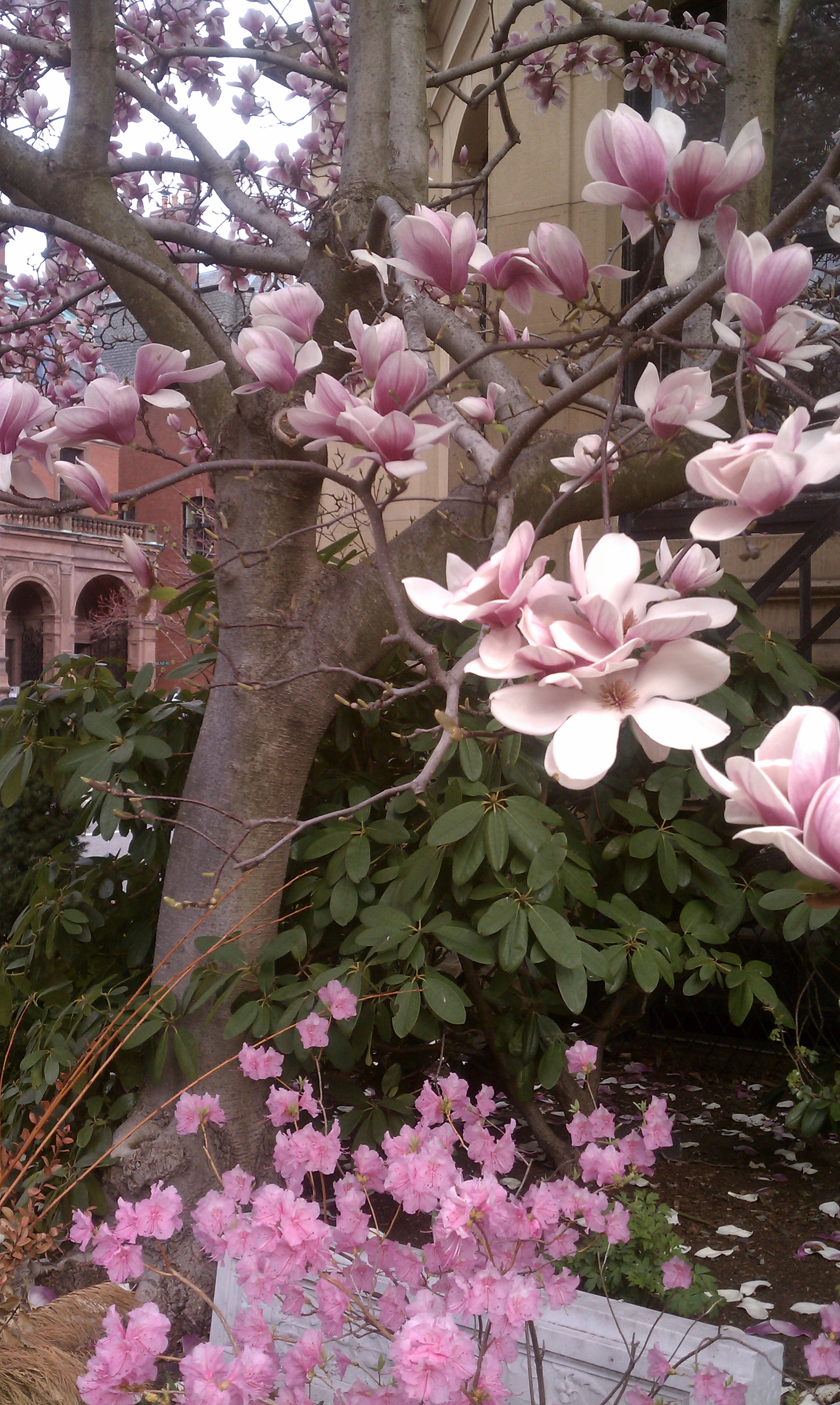 Just had to share a few photos of the trees blooming along Commonwealth Avenue. High temperatures in mid March pushed open the lush petal cups. This year the blooms seem even more eye-popping and the sweet aroma intoxicating. These trees were planted in 1963 through the efforts of the Garden Club of the Back Bay’s Laura Dwight. Thank you Laura!