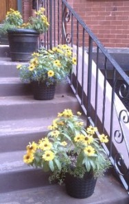 Black-eyed Susan's poking through a black iron fenceFor the past several weeks I’ve been noticing the abundance and health of this perky perennial in gardens all over the neighborhoood. With so many colorful flowers past their peak, these bright yellow and sometimes purple flowers with the dark centers are finally getting attention!  I did a bit of research on these wildflower stunners and found out they are long-lived, low maintenance plants with a tolerance for clay soils. They prefer full sun but tolerate partial shade.  When they are planted in large groups, butterflies love them.  One article I read said they are considered bioremediators.  It seems that their roots and foliage tie up toxins from the soil and air.  What a great benefit for a city flower!